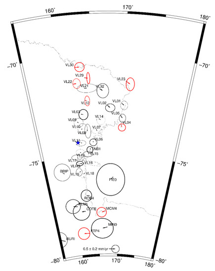 The southern sector extends approximately in the range of latitude between 77° S and 80° S. The two meaningful residual vectors indicate a westward motion around 0.2 mm/yr.