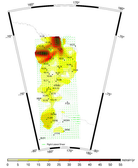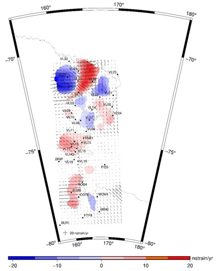 In Antarctica, GNSS stations located on rocky outcrops are distributed in areas not covered by ice along the coasts, so the strain rate field analysis can only be performed along these narrow strips of the continent. This is also applied to VL, which is located near the boundary between West and East Antarctica (Figure 1).