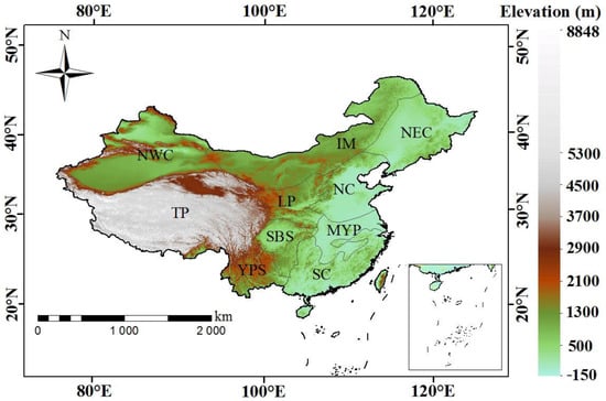 China is located at 73°33′E–135°05′E, 3°51′N–53°33′N with a total land area of 9.6 million square meters, which is a vast and complex terrain. Therefore, SSR showed a significant spatial difference in China. According to the ecological geographical division of China and the nine agricultural divisions of China provided by the Resource and Environment Science and Data Center of Chinese Academy of Sciences (http://www.resdc.cn/), we divided China’s mainland into different climatic regions (Figure 1), including northeast China (NEC), northwest China (NWC), Inner Mongolia (IM), Tibet Plateau (TP), North China (NC), Loess Plateau (LP), middle-lower Yangtze Plain (MYP), Sichuan and surrounding regions (SBS), Yunnan Plateau and surrounding regions (YPS), and southern China (SC).