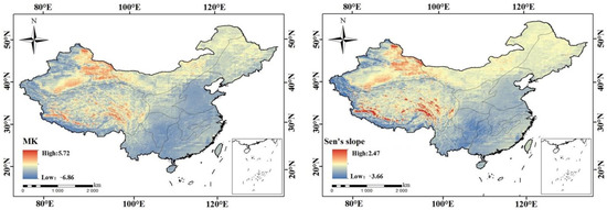 The Mann–Kendal trend test (MK) and Sen’s slope for SSR over China from 1984 to 2016.
