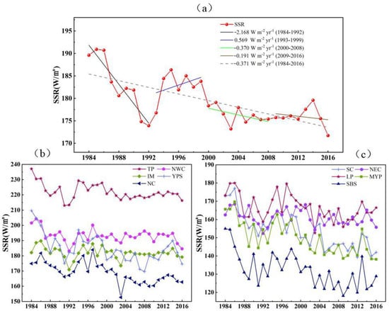The stated trends of the averaged SSR in China from 1984 to 2016 are illustrated in Figure 5a. During the entire research period (1984–2016), there is a slightly negative trend (−0.371 Wm−2 yr−1), with annual average SSR values of 171.74–190.92 Wm−2. Averaged over the China’s mainland, the SSR decreases from 1984 to 1992 at a rate of around −2.168 Wm−2 yr−1, then, increases from 1993 to 1999 with a rate of around 0.569 Wm−2 yr−1, then, decreases from 2000 to 2008 at a rate of around −0.370 Wm−2 yr−1, and then decreases after 2008 with a rate of around −0.191 Wm−2 yr−1. As seen in Figure 5a, low SSR is shown in 1992 (173.94 Wm−2), corresponding to the Pinatubo eruption, in June 1991, over the Filipinas Islands [42]. This volcanic eruption released a large amount of smoke and ash into the atmosphere, resulting in the rise in aerosol particle concentration. Volcanic aerosols presented a significant influence on SSR for a few years, after the eruption. Although the effect of a volcanic eruption on SSR disappears in a few years, the long-term trend of SSR may not change [8,43]. The “solar brightening” was similar in most countries of the world from 1990 to 2000. However, after 2000s, the values of SSR in China began to decrease gradually. This can largely be explained by the rapidly growing sulfur emissions in Asia that exceeded those of western countries [44]. It is worth noting that SSR dropped to a low value in 2003, which may be due to the Popocatepetl volcano, in 2003, which erupted three times on that day, with intense activity in Mexico. This decline trend of SSR did not persist, but it was transformed into a weak “solar brightening” in 2008, which could be related to the 2008 Olympic Games in Beijing, when a series of energy conservation and emission reduction policies were advocated [45].