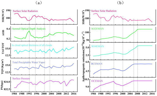 With the rapid development of the global economy, human activities increasingly release micro particles and greenhouse gases into the atmosphere, which, in turn, gradually change the climate trend and energy flow in the atmosphere [31,47]. The temporal trends of anthropogenic emissions (SO2, SO4, BC, and OC) and SSR from 1984 to 2016 are illustrated in Figure 6b. During 1984–1995, the emissions of four pollutants maintained an increasing trend, corresponding to the decline trends in SSR. The over-increased trends of anthropogenic emissions were controlled in 2005. The Chinese government issued a series of laws and regulations. A quantitative emission control target on SO2 emissions was put in effect by the 11th 5-Year Plan of China (http://www.gov.cn), in 2006, and it is the most influential regulation.