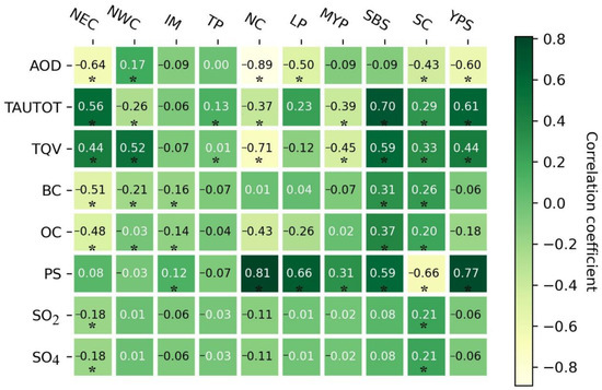 As shown in Figure 7, the results revealed that the AOD was the dominant factor of SSR over NEC with r values of −0.65, followed by BC (−0.51) and OC (−0.48). The large amount of coal burning in the northeast industrial base and the population concentration in NEC, as well as this region has become a high energy consumption area, leads to more pollutant emissions. Although the content of BC in the atmosphere is small, it has a strong light absorption capacity, because it can absorb short wave radiation and release long wave radiation [51]. Meanwhile, OC can directly affect and reduce visibility by scattering light, and indirectly affect the radiation balance by absorbing some hygroscopic chemical components [52]. The TAUTOT and BC had a certain impact on the variation of SSR in NWC, because in these remote areas the air is relatively clean; therefore, a change in cloud characteristics would affect SSR budget of the region [47]. Furthermore, biomass burning has become the main fuel over NWC, the biomass combustion has a greater contribution to the emission of black carbon, which greatly contributes to BC emissions; BC has a strong absorption of solar radiation in the earth’s atmosphere.