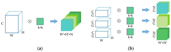 As shown in Figure 2a, the size of input data is , representing the number of channels, width, and height of the feature map, respectively. The size of the convolution kernel is , and the number of the kernels is . At this point, the size of the output feature map is . The parameter number of N convolution kernels is: