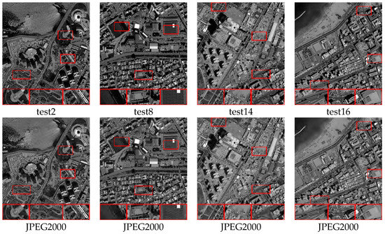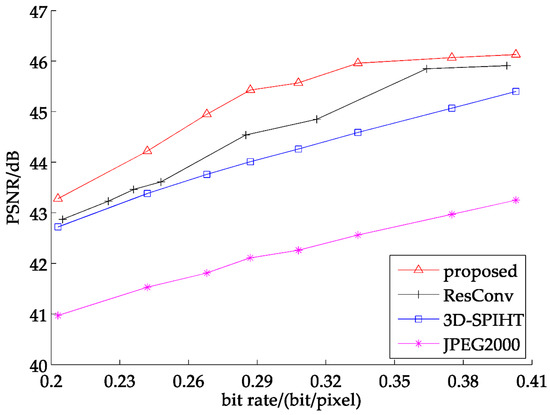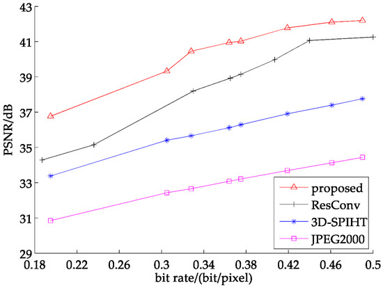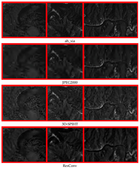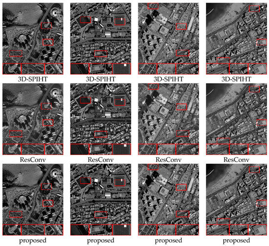 For visual comparison, as shown in Figure 14 and Figure 15, the JPEG2000 method inevitably generates serious block and ring effects, and detailed texture is ignored too. Furthermore, 3D-SPIHT is relatively better than JPEG2000; however, there are still a lot of blurred texture details in the recovered images. ResConv also obtains recovered images with blurred texture. On the contrary, the algorithm we proposed can retain the detailed texture and edge information of the images to a great extent.