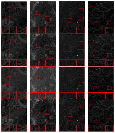 For illustrative purposes, Figure 10 shows the visual effects of four test images when the bit rate is around 0.4. To be specific, we display the grayscale image of the third band of the test image to show the differences more clearly. As can be seen from it, with the JPEG2000 and 3D-SPIHT algorithms, the recovered images have obvious block effects and the textures and margins are seriously blurred, whereas the proposed partitioned extraction algorithm performs well under the same bit rate, the same with ResConv, and these two methods preserve more details than any other methods. Figure 11 shows the partial enlarged view of ah_xia for a clearer demonstration. When the bit rate is around 0.4, ResConv and our proposed method both demonstrate impressive performance. However, according to Figure 8, ResConv starts to lose its edge as the bit rate drops to 0.3 or even lower and our method is then more stable.