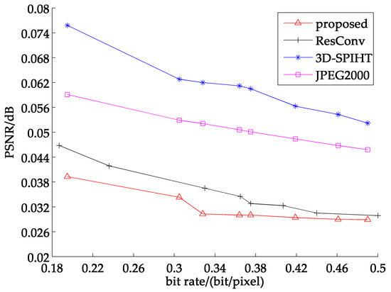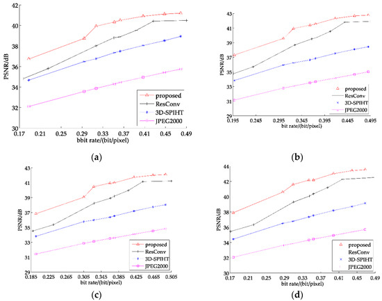 Figure 13 represents the comparison of the PSNR of four test images from 8 band test sets at different bit rates. It can be observed that the advantage of the partitioned extraction method becomes quite prominent, compared with the result of the 7 band test images. Regarding ResConv, in spite of it surpassing JPEG2000 and 3D-SPIHT, its inferiority to our proposed method is more distinct compared with the results of the 7 band test sets. When it comes to processing multispectral images with more bands, or even hyperspectral images, some traditional compression methods will ineluctably be in a more inferior position, as they rarely take the abundant spectral correlation into account.