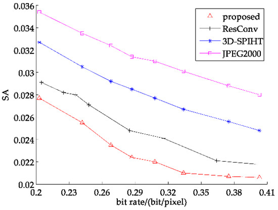To adapt to our partitioned extraction network structure and verify the effectiveness of spectral information recovery as well, we adopt the SA as the second evaluation criterion. The average SA curves of 7 band and 8 band test sets are shown in Figure 16 and Figure 17, respectively. As seen below, we can find that the SA of the images reconstructed by the partitioned extraction algorithm is always smaller than that of JPEG2000, 3D-SPIHT and ResConv. Table 2 and Table 3 list the detailed SA values of four representative test images of 7 band and 8 band, respectively. Supported by the chart and data below, it can be proven that the partitioned extraction algorithm obtains the smallest SA at all bit rates compared with the other three methods, and the smaller SA indicates that the images reconstructed by the proposed partitioned extraction method can obtain better spectral information recovery.