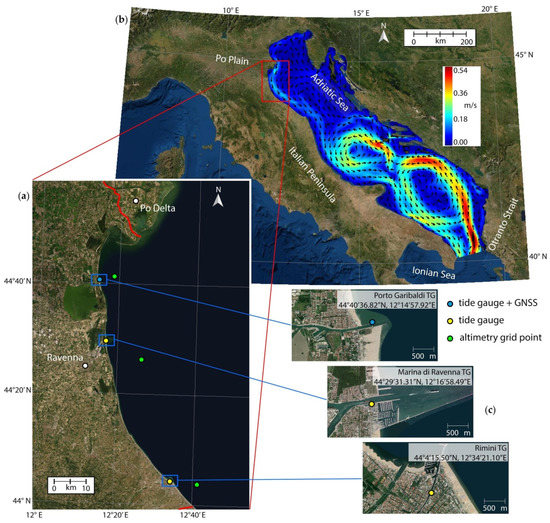 Satellite overview of the study site. (a) The E-R coast with northern and southern limits marked by red lines, the location of the selected tide gauges (blue and yellow circles) and their nearest satellite altimetry grid points (green circles). The blue circle at Porto Garibaldi remarks that, differently from the other two, the TG site is co-located with a GNSS antenna. (b) map of the surficial (upper 10 m layer) Adriatic current directions and velocity vectors (November 2018 monthly average, based on the MEDSEA_REANALYSIS_PHYS_006_004 model) [49]. (c) Detailed location of the three tide gauges considered in this work.