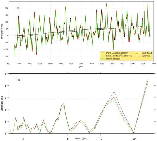 Assessing the rate of sea-level variations is a complicated task exacerbated when time series are short and possibly affected by multi-annual and decadal oscillations, difficult to determine on the short term. However, we stick on standard trend assessment by means of ordinary least squares (using NumPy’s Python library [86]) to ease the comparison with previous results even though we are conscious that more sophisticated analysis could provide different results and that this approach neglects the autocorrelation of the time series. This weakness is compensated by the characterization of the periodic signals using two separate approaches, first we compute the Lomb–Scargle periodogram [87,88] (LSP) for each time series to provide a complete description of the frequency content by using the Lomb package [89] implemented in R [90]. Then, we apply the Empirical Mode Decomposition (EMD) method [91,92], a standard method for splitting non-linear and non-stationary time series into a limited sequence of empirically orthogonal “intrinsic mode functions” (IMFs) that describe cyclic modes not necessarily characterized by a constant amplitude nor phase. Differently from traditional spectral methods, the EMD is not requiring assumptions on the functional expression of the regression model. This allows us to decompose each time series in sequence of IMFs plus a residual. The latter, normally monotonic, helps to define how a linear trend is a good model for the non-periodic component of each time series. The significance of the resulting trends is discerned by means of standard test [93] that checks the probability of the null hypothesis to be true. This test is reported beside each trend with its significance code: *** p < 0.001; ** p < 0.01; * p < 0.05; ° p < 0.1; ‘ ‘ (blank) p < 1.