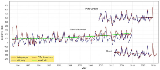 Finally, as already observed for other coastal areas [11,13,69], the good match between altimetry and in situ observation confirms that high-standard satellite product can provide consistent data even at short distance from the coast. Linking satellite altimetry measurements with tide gauge, by bridging the open-ocean measurements with those in proximity of the coast [12] is part of a new challenge in monitoring sea-level rise along coastal tracts. In this view, the maintenance and implementation of observation stations for continuous monitoring of sea level in the coastal zone is a fundamental tool for coastal management and defense strategies.