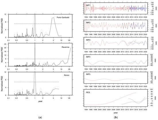 (a) Normalized power spectral density (PSD) periodogram resulting from the LSP analysis for TGPG, TGRA, TGRN time series. In each frame, the dotted line represents the periodogram for raw data while the solid line is the periodogram for IB-corrected time series. The dashed horizontal line represents the significance (90%); (b) EMD for IB-corrected data. Red for Ravenna, black for Porto Garibaldi, and blue for Rimini. The Y axis of the two bottom frames have been enlarged to better visualize the small amplitude signals.