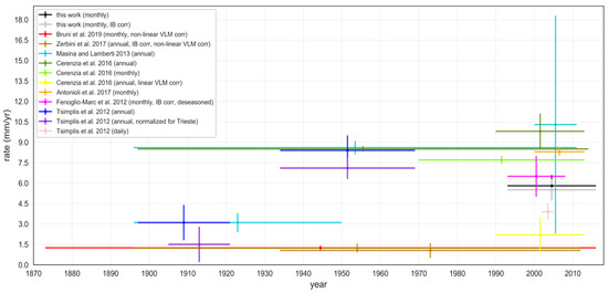 One further cause of the variability in SL rate and corresponding uncertainties is the different data processing and different corrections applied. An example of the above cited complexity is the Marina di Ravenna site for which several previous studies exist, based on the same TG time series but using different methodologies and adopted corrections, as shown in Figure 5 where the results of some of the most representative studies conducted on TGRA are summarized (see also Table A1). There is a relation between the time series length and the error size of the trend resulting from OLS regression, i.e., the error scales inversely with the number of samples of the analyzed time series [104]. Rate for longest datasets generally agree, but only when similar data corrections are applied: Zerbini et al. [73] and Bruni et al. [74] removed from data the non-linear VLM resulting from GNSS data, while Cerenzia et al. [60] accounted for the linear VLM (from various geodetic data), and Tsimplis et al. [41] normalized the data with respect to the TG time series of Trieste (considered to be a tectonic stable site). Rates computed from long time series without VLM correction are significantly higher [41,60,105] but still relatively grouped. By contrast, rates from short time series (i.e., less than 20 years, see [60,68,105,106]) denote extreme variability and inconsistency between them regardless of the corrections applied, e.g., IB correction and deseasoning, whose influence is relatively low here with respect to the crustal movements corrections. This highlights how the natural variability and the contribution of VLMs strongly influences the RSL signal at the TGs, preventing the estimate of a univocal sea-level trend valid at the short-, middle-, and long-term scales. Given the short time spans and the described complexities, we thus cannot establish if and how the observed trends could be representative of the long-term rate of RSL rise. Also, the time series analyzed in this work (Figure 3; Table 2) suggest that a not constant rate of subsidence might play a crucial role in the observed RSL change at this time scale.