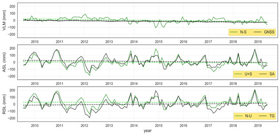 where S is the RSL variation, N represents the ASL variation and U is vertical displacement [21,22]. This equation tells that the sea-level change at the pier is the combination of the absolute seal level variation in a geocentric reference frame minus the vertical displacement at the TG coastal location.