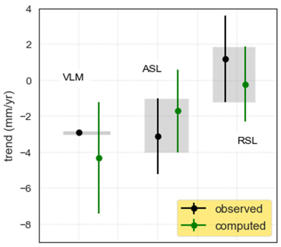 The comparison of linear trend estimates from observed data (black) and those computed (green) at Porto Garibaldi. Dots represent the central values with their standard deviation depicted by the line. Grey areas show the common interval between the different datasets trend values. It can be noted that the values of the observed and computed trends match within their error bars.