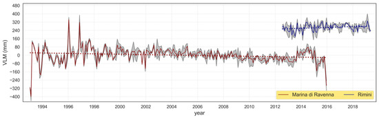 Integrated data on vertical deformations (topographic levelling, GNSS and InSAR) of selected benchmarks of the E-R Coastal Geodetic Network and data previously acquired in the framework of the Regional Network for subsidence monitoring [112], provide gradually decreasing subsidence rates for all the coastal sites under study in the last 25 years [55,57] (Table 4). These data are gridded at 100 m × 100 m and reproduced as isokinetics of VLM at the regional scale; associated error is estimated as ±2 mm/year [57]. For the area that contains the TG data, rates summarized in Table 4 can be considered representative of the subsidence. Actually, these data agree with the rate observed by GNSS at Porto Garibaldi and Marina di Ravenna. For Rimini, subsidence data suggest that this phenomenon is gradually decreasing but not inverted, as the negative rate of RSL rise might suggest.