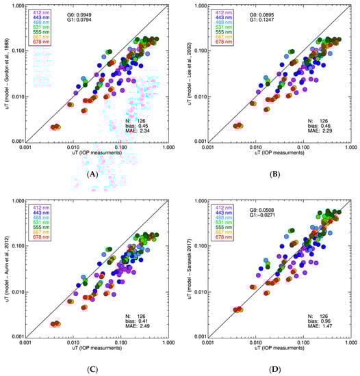 In Sarawak coastal waters, the parameterisations by Gordon et al. [], Lee et al. [], and Aurin et al. [] generally underestimated uT values, even though they showed acceptable linearity, with the spectrally varying conversion factors of Aurin et al. [], yielding slightly lower bias than the other two approaches (Figure 4A–C). To improve agreement between modelled and measured uT values, we used Sarawak region-specific values (G0 = 0.0508) and G1 = −0.0271), which were generated through optimisation of regional values of rrs(0−) and uT. Using these Sarawak-specific values in the relationship between rrs(0−) and uT (Equation (14)) resulted in a better match of uT (Figure 4D).