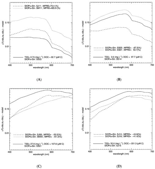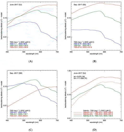 Moreover, the shape and magnitude of uT spectra close to the river mouths changed according to hydrodynamic conditions (Figure 5D). Sarawak experiences a meso-tidal range of up to 5 m, which together with the multiple river discharges results in optically complex conditions, as also seen in coastal waters elsewhere [,]. In June 2017, we sampled coastal waters off the Igan distributary in the Rajang delta (2.875°N 111.638°E) over a period of 14 h to understand the influence of Igan river discharges. Initially at a salinity of 13.1, the values of TSS and DOC were 25.4 mg L−1 and 209.3 µM C, which caused higher uT values in the red region (dashed red line; Figure 5D). As salinity decreased to 8 and TSS concentrations increased by 51%, uT increased across the spectrum (solid red line; Figure 5D). The river plume receded after another 10 h: salinity increased to 21.5 and TSS and DOC were reduced, such that the uT spectrum shifted to have a maximum in the green region (500–600 nm; solid green line in Figure 5D). Because our spectral library includes SIOPs from different hydrodynamic conditions encountered in Sarawak coastal waters, it thus has the ability to simulate the range of optical signatures encountered in these dynamic coastal waters.
