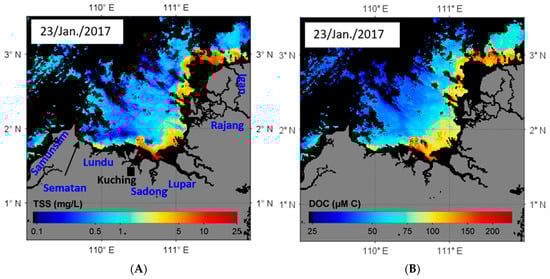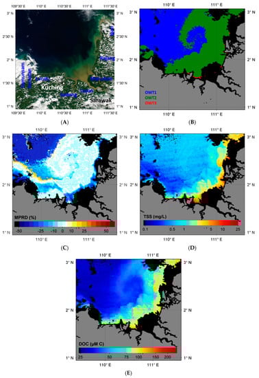 Coastal waters in Sarawak, Malaysia, host ecologically and economically valuable marine habitats and fish populations [,]. Land adjacent to ocean in Sarawak is mostly forested and includes large areas of coastal, tropical peatlands []. Climate change and anthropogenic activity in Sarawak are known to impact land cover and the suspended material discharged into the coastal oceans [,]. Previous studies in Sarawak mainly used in-situ water sampling to measure TSS and DOC [,], which only provides spatially and temporally limited insights into the processes driving variability. Remote sensing could significantly improve the resolution of water quality observations in Sarawak. For instance, a recent study proposed an algorithm to estimate riverine DOC fluxes from rivers in Sarawak []. Still, this work focused only on the immediate areas surrounding river plumes and only used an empirical band-ratio algorithm; it also did not address TSS retrieval. Thus, to our knowledge, there are no remote sensing algorithms that could retrieve both TSS and DOC concentrations either from in-situ sensors or from satellite-based sensors across coastal waters of Sarawak. Here, we provide the first analysis of bio-optical properties in coastal waters of Sarawak. The objectives of this study are to: