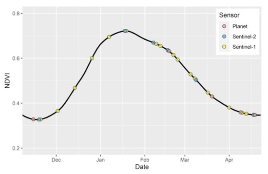 Image acquisition dates for the three sensors during the 2016–2017 winter growing season plotted against average NDVI values produced using MODIS satellite imagery for our study region.