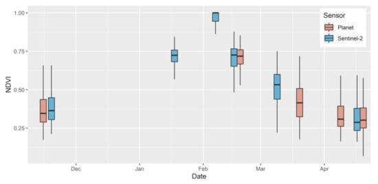 We accessed all available cloud-free Planet surface reflectance data (PlanetScope AnalyticMS level 3B product) covering our study region and period (Figure 2) through Planet’s API []; we similarly identified cloud-free scenes via the visual interpretation of imagery. Each image was also visually inspected for any geo-referencing errors by overlaying Planet images over the base satellite imagery in ArcGIS. As band values from Planet were not comparable with those from Sentinel-2, likely due to differences in sensor characteristics, atmospheric correction methods, and the relatively poor quality of surface reflectance correction for Planet [], we performed histogram stretching of Planet and Sentinel-2 surface reflectance data using methods from Jain et al. []. Specifically, we linearly transformed histograms of each Planet band to match histograms of the same bands from Sentinel-2 images. For this correction, we used Sentinel-2 data from the date that was closest to the date of the Planet imagery. If there was no Sentinel-2 image that was within a few days of the Planet date, we took the inverse distance-weighted value between the closest Sentinel-2 dates before and after the Planet image date following methods from Jain et al. []. After histogram matching, both Sentinel-2 and Planet NDVI showed similar values and a consistent phenology (Figure 3). The 15 November 2016 Planet scene did not cover our entire study area, including 47 of the reference polygons. To keep all analyses constant across sensors, we removed these 47 polygons from all remaining analyses, reducing the final number of polygons used to 277.