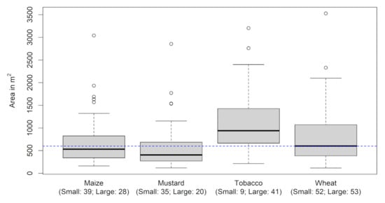 Farm sizes based on crop types. The x-axis labels also show the number of small and large farms based on the 600 m2 threshold (dotted horizontal line) obtained from the field survey.
