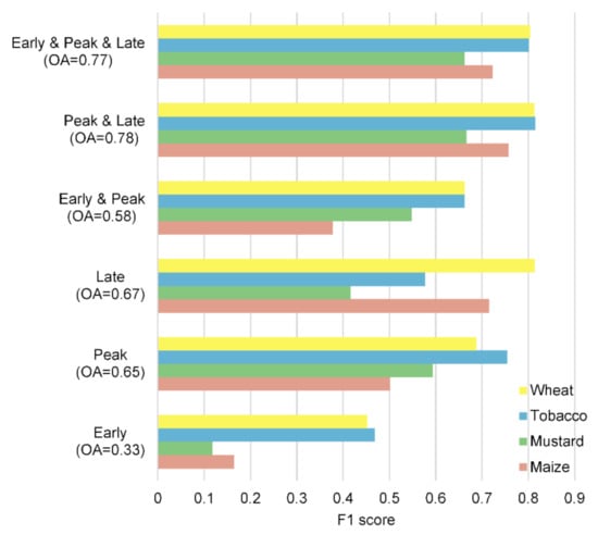 Considering research question 3, we found that the late season (i.e., late-March to mid-April) led to the highest classification accuracy (0.67) when the three-sensor SVM was run separately using images from one of the three stages of the growing period (early, peak, and late, Figure 5, Tables S6–S11). The overall accuracy and F1 scores for all four crops were quite low when only early-season images were used (Figure 5). The time period that resulted in the highest accuracy varied based on crop type. The F1 scores for mustard and tobacco were highest when using peak-season images, while the F1 scores were highest when using late-season images for maize and wheat. This was likely due to differences in phenologies and harvest dates across crops (Figure 6). Generally, the classification accuracies improved as more growing seasons were considered in the model, though adding early-season images did not improve the model fit compared to only using peak and late-season images (Figure 5, Tables S6–S11).