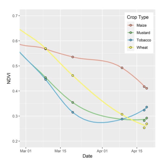 The classification accuracy also varied based on the timing of imagery used (Figure 5). Early-season images did little to improve classification accuracies, likely because crops are challenging to differentiate during the early stages of crop growth when crops have little biomass []. Peak- and late-season imagery were found to be particularly useful for classifying crop type, with peak-season images improving the classification accuracies for mustard and tobacco and late-season images improving the classification accuracies for maize and wheat. This is likely due to differences in the planting and harvest dates of these four crops, with mustard and tobacco being harvested earlier (late March) than wheat and maize (early to late April; Figure 6). These results suggest that only using imagery for the second half of the crop growth cycle is likely adequate for mapping crop types in this area.