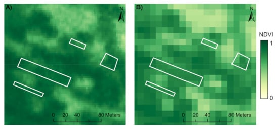 Several field polygons overlaid on (A) Planet satellite imagery and (B) Sentinel-2 satellite imagery. The spatial resolution of Planet (3 m; A) better matches the size of fields and results in fewer mixed pixels compared to Sentinel-2 imagery (10 m; B).