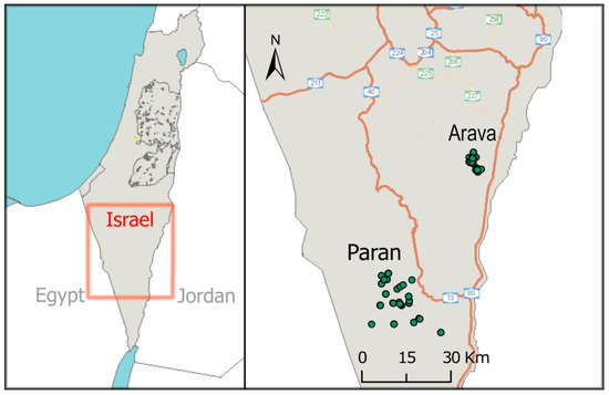 The sampling areas extended over 4 × 6.6 km2 and 16 × 17 km2 in the Arava and Paran release sites, respectively (Figure 1).