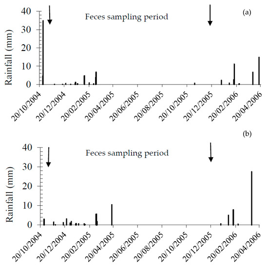 Rainfall during the project in the Arava (a) and Paran (b) sites: arrows indicate the initiation and end of fecal sampling period.