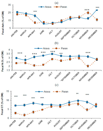 Fecal concentrations of (a) ash (% of dry matter); (b) N (% of organic matter); and (c) condensed tannins (% of organic matter) in Oryx released at the Arava and Paran sites: monthly averages and SE. *** p < 0.001; ** p < 0.01; * p < 0.05.