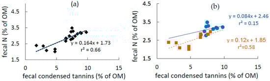 The relationship between monthly averages of fecal N and condensed tannins in (a) the whole oryx population (♦) or (b) analysed separately by release site: Paran (■, ---) and Arava (●, ⸻).