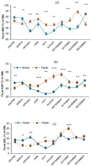 Concentrations of (a) neutral detergent fiber (NDF; % of organic matter); (b) acid detergent fiber (ADF, % of organic matter); and (c) acid detergent lignin (c; % of organic matter) in the feces of oryx released at the Arava and Paran sites: monthly averages and SE. *** p < 0.001; ** p < 0.01; * p < 0.05.