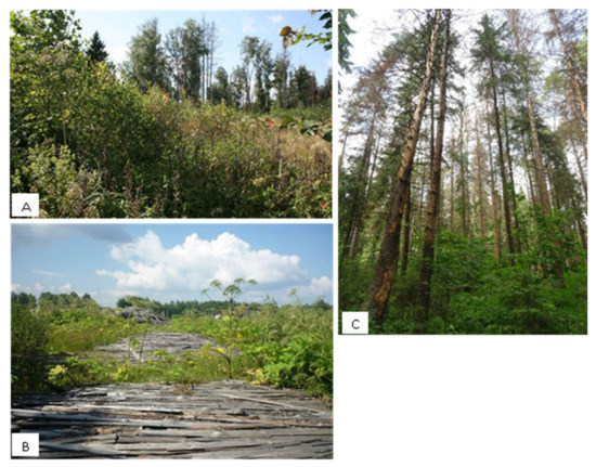 Some examples of the consequences of natural and anthropogenic disturbances. (A)—Overgrown felling with small-leaved species (Betula pendula, B. pubescens, Populus tremula, and Salix spp.); (B)—abandoned farmland. Results of overgrowing of treeless lands of Heracleum Sosnowskyi, introduced from the Caucasus after WWII as a new fodder crop. Currently, the fight against Heracleum Sosnowskyi is being carried out on 30 thousand hectares of land near Moscow; (C)—spruce forest affected by bark beetle Ips typographus. Monodominant and coeval spruce plantations are especially actively affected (Photo by T.V. Chernenkova).