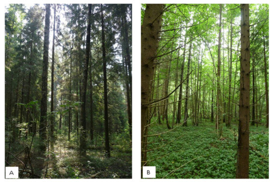 Primary forests have not survived in the MR by now. Conditionally indigenous communities are widespread in the MR. Under “Conditionally indigenous” we suppose the forests that are close to indigenous analogs in the composition of tree and subordinate layers, but significantly differ from them in age structure. Consequently, the forest cover of the MR is represented by the succession mosaic of forests of different composition, age, and origin. The proportion of coniferous forests in forest cover area is 45% currently [51], of which the spruce forests occupy 25%, the pine forests occupy 20%. The proportion of plantations is about 22% of the Stare Forest Fund of the MR [51]. At the same time plantations do not include forests over 60–80 years according to the rules of the State Forest Inventory. They are renamed to “natural forest stands” after reaching 60 years age. Because coniferous stands are mainly silvicultural, at the same time oak, linden, fir, and Siberian larch are relatively sparse species, it can be concluded that the predominant part of “mature” coniferous forests (60–80%) in the MR are plantations. These data are consistent with the opinion of other experts [52,53].