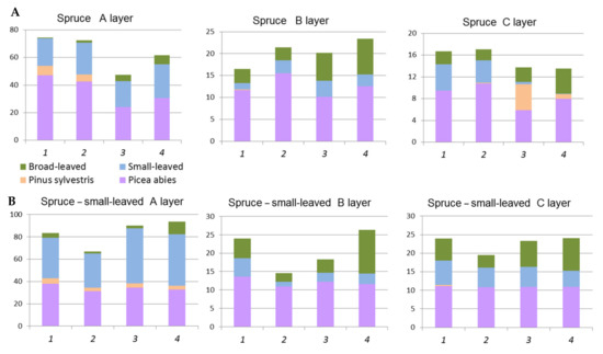 Each formation is represented by communities with different combinations of common dominating species in an underlayer. The identification of syntaxa at the level of association group was performed basing on the prevailing ecological and morphological groups of plants in subordinate layers. Each spruce and spruce–small-leaved forest formation is represented by four or six association groups [72].