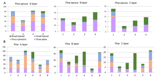 The classification of communities was done in accordance with ecological-phytocoenotic approach [71]. Syntaxons in the ranks of formation and association group are distinguished based on dominant tree species and representation of ecological and morphological groups in an underlayer. We selected relevés with dominance of spruce or pine to study the composition and the structure of formation with the participation of coniferous stands. We selected relevés where spruce accounted for 75% and more as the spruce forests formation. Respectively, we selected relevés where spruce and aspen/birch stands were almost equal as the spruce–small-leaved formation. Similarly, we selected relevés where pine accounted for 75% and more as the pine formation, and relevés where the proportions of spruce and pine were almost equal as the pine–spruce formation.