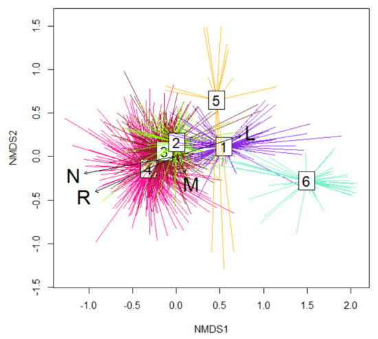 Indirect ordination methods were applied to interpret the ecology of groups—the nonmetric multidimensional scaling (NMDS ordination) in the R software environment [74], using the square root transformation, the Wisconsin double standardization, and the Bray–Curtis distance [75]. Values of the Ellenberg’s ecological factors (given in scores for each species according to Ellenberg) were calculated for axes during ordination and interpretation [76,77]. The indicators such as light (L), nutrients (N), soil pH (R), and moisture (M) were calculated using software Juice 7.0 [78] for each relevé (weighted by species cover). The factors values were used to position ecological factors vectors in an ordination space and to assess the differences between community groups. Note that some uncertainty is typical for all ecological scales. However, due to the lack of field measurements of environmental variables, we used literature data to interpret ecological differentiation of communities. The differentiation of groups was analyzed basing on the composition of subordinate layers B, C, and D.