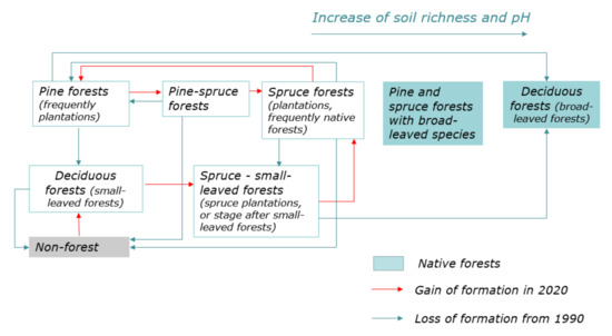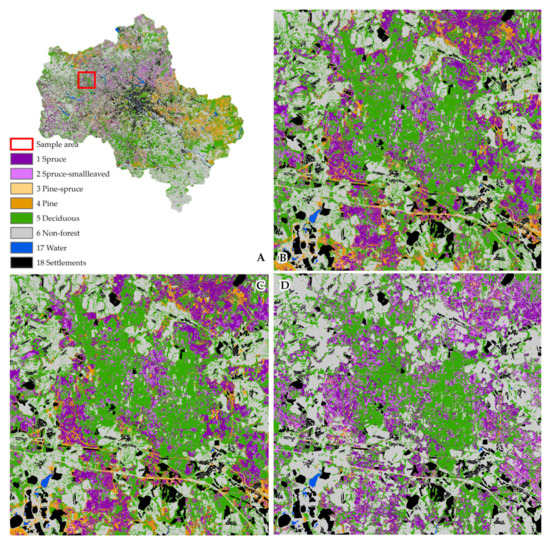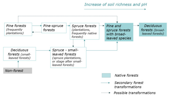 The centuries-old history of anthropogenic activity has led to highly fragmented and relatively young forest cover in the central part of eastern Europe, since almost the entire territory was impacted by various types of agriculture, forest felling, and silviculture. Taking into account the human economic activity, there is a reason to interpret the factors of the land cover change and to consider two directions of distinguishing territorial units: (a) according to “stable” natural characteristics [1,2], and (b) as a result of the interaction of natural and socio-economic relations [3,4,5]. It is believed that the changes of the vegetation cover are subordinate to the anthropogenic factor in most regions of Europe at local level (the lower level of the spatial scale). It was found that, for background intact areas, the features of the structure and functioning of vegetation are largely determined by natural factors, including regional and local climate conditions [6,7,8], the composition of tree dominants, and the set of local flora [9,10]. Assessment of the joint impact of the factor’s combination for active land use areas (including the previous types of anthropogenic impact) is necessary for understanding the modern dynamics of forest vegetation at a regional level.
