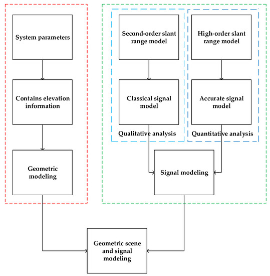 Based on the previous research results, this paper comprehensively considers the use of high-order slant range model in the compensation of space-variant error caused by elevation. The coefficients of this model are related to range, azimuth and elevation. On account of Taylor expansion and series of inversion method [22], the high-order slant range model is taken into signal model, and the relationship of target elevation and location is considered, then the elevation spatial variation is decomposed to 2D range and azimuth spatial variation [23,24]. An improved Range-Doppler Azimuth Chirp Scaling (RD-ACS) algorithm is proposed by considering the high-order Taylor slant range model of spatial variation into the imaging processing. After the elevation decomposition, range spatially variant and azimuth time variant compensation are performed to achieve focusing processing. This allows imaging processing in the frequency domain to compensate for the 3D space variation involving the elevation space variation, eventually allowing to realize high-precision imaging.