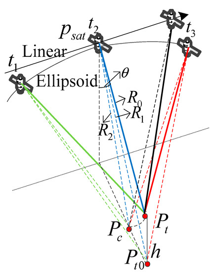 In light of Equation (11), , such corresponding point does exist. The slant range history from the target to the satellite and from the corresponding point to the satellite are the same at different times.