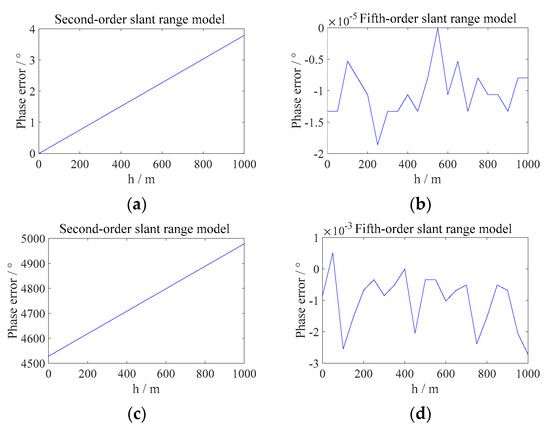 Firstly, the phase error variation with elevation is analyzed when the classical second-order slant range model and the fifth-order Taylor expansion slant range model are used as the target’s true slant range history in the LEO SAR and GEO SAR systems. The result is shown in Figure 3.