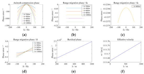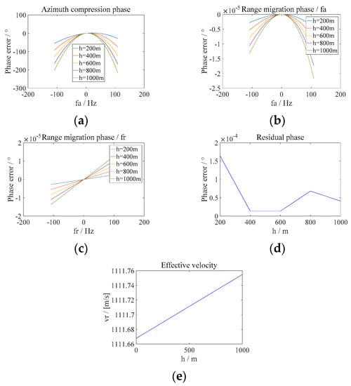 For the fifth-order slant range model shown in Equation (6), the elevation of the target will affect and the coefficients of each order. In order to intuitively and quantitatively analyze the influence of the elevation, several groups of point targets with different elevations are set, and the target elevations are 200 m, 400 m, 600 m, 800 m, and 1000 m in turn. It can be clearly seen that the elevation information has no effect on the range compression phase. The influence of the elevation on the other decomposition phases is mainly analyzed below.