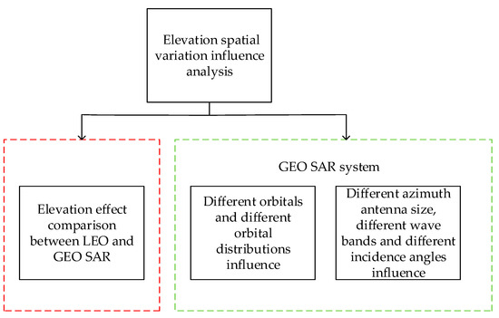 In this section, the difference of elevation influence between GEO SAR and LEO SAR is first analyzed, and the reason why elevation space variation is not necessary to be considered in LEO SAR is explained. Then, in the case of different orbital types, different position distributions on orbit, different azimuth antenna sizes, different wave bands and different incidence angles, the influences of target elevation on the overall phase error are analyzed. Figure 6 lists the factors mentioned above.
