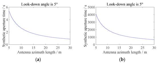 The difference between GEO SAR and LEO SAR is the satellite’s orbital altitude. GEO SAR has an orbital altitude of about 36,000 km. The paper will compare GEO SAR and LEO SAR with an orbit of 792 km to analyze the influence of elevation. The synthetic aperture time also varies due to the significant difference in orbital altitude. A new synthetic aperture time calculation method is proposed [27]. The variation trend of synthetic aperture time with antenna azimuth size in GEO SAR and LEO SAR is given below. In the following error analysis, if there is no special explanation for some parameters, system parameters are shown in Table 1.