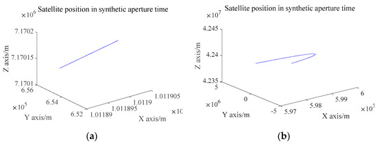 As can be seen from Figure 7 the synthetic aperture time is very short at low orbit, only a few seconds, whereas in the GEO system, the synthetic aperture time is thousands of seconds. Therefore, during the irradiation of the target, the curved flight trajectory of the satellite in the low orbit mode can be approximately regarded as linear motion, while the satellite trajectory in the GEO mode is ellipsoidal. Figure 8 shows the flight trajectories of satellites with a synthetic aperture time of 2 s in LEO mode and 2000 s in GEO mode, respectively: