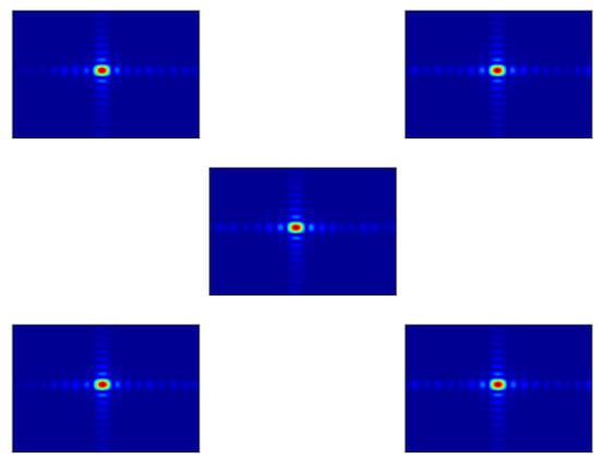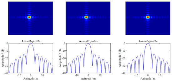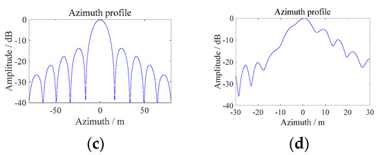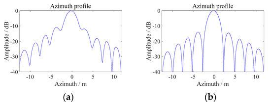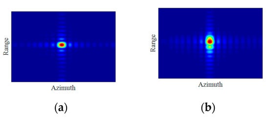 As can be seen from the above equations, the second exponential phase of the focused signal is the secondary phase of , which will cause defocus in the azimuth direction, and the azimuth defocus will become more serious as increases. By comparing Equations (4) and (5), it can be seen that, compared with the range migration phase error, the phase term of azimuth compression is larger, which will cause serious azimuth defocus.