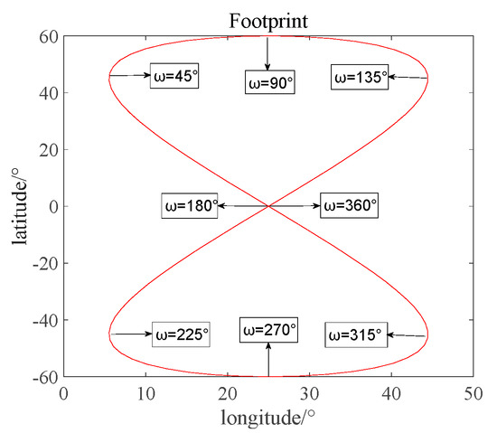 It can be seen from Figure 13 that the footprints in the shape of “8” are symmetric. Except for the two overlapping points at latitude = 0° (ω = 90° and ω = 270°), the errors of the other two points with the symmetry of longitude lines are the same. When ω = 360°, the footprints are located at the equator, and the phase error at this position is the smallest. It can be seen that the position is conducive to conducting some research on elevation direction. Therefore, the analysis following in this paper will set ω = 360° for research.