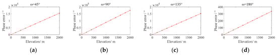The phase error variation of each decomposition phase with elevation is analyzed below. In the geometric model shown in Figure 2, the phase difference between target and target was selected as the research object in order to obtain the influence of elevation on each decomposition phase of the echo signal and correspond to the qualitative analysis in Section 2.1. However, in the SAR imaging processing, targets within the irradiation range are projected to the slant range of the antenna upward. In fact, the phase error introduced by the elevation is the phase difference between the target and its corresponding point . Therefore, this paper also analyzes the phase error introduced by the target elevation information in the focusing process of SAR image, and it analyzes it from each decomposed phase.